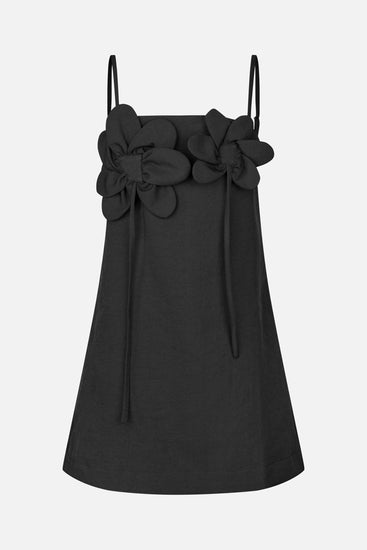 The Adriana Dress reimagines the timeless little black dress with a modern twist. Crafted from finely woven fabric that creates a beautifully structured silhouette, this minidress features delightful flower appliqués at the chest for a touch of whimsy. The fitted bodice flows into a relaxed A-line shape, while adjustable thin straps ensure a personalized fit.