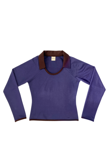 A modern take on the classic polo. The French Terry Polo is crafted from a lightweight cotton-blend knit with natural stretch and a soft, brushed hand feel. The silhouette stays sharp with a cropped fit and contrast chocolate binding at the neckline, cuffs, and hem. Designed in a deep navy blue that reads sleek and elevated, this top holds its shape, resists wrinkles, and stays effortless from morning to late-night errands. Easy to dress up, easy to live in.