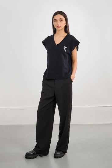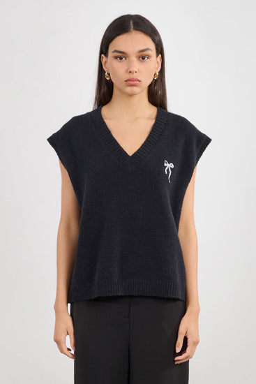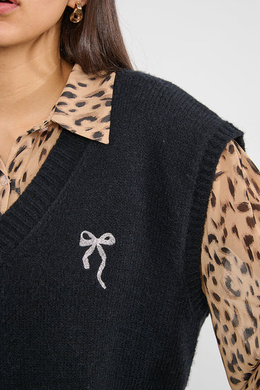 A cozy-cool essential with a playful twist. This black oversized sweater vest features a wide V-neckline, straight relaxed fit, and a charming embroidered bow at the chest. The soft knit drapes effortlessly, making it the perfect layering piece for fall and winter styling.