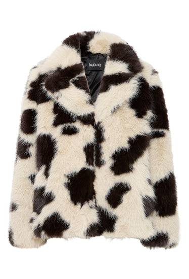 A soft statement in black and white. This faux fur coat brings instant texture and personality with its bold graphic print and plush hand feel. The hip-length cut and regular fit make it an easy everyday layer, while long sleeves and smooth lining keep things cozy. Equal parts playful and polished, it’s the kind of coat that turns a simple outfit into a full look.