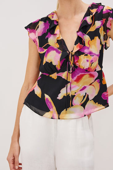 The Carmine Top brings a playful, ultra-feminine vibe to your wardrobe with its delicate chiffon fabric and flutter sleeves. Featuring a ruffled V-neckline and a charming front tie, this top flatters with an empire waist silhouette that flows effortlessly.