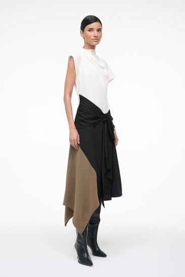 The Davina Dress is a fluid, asymmetrical silhouette designed for easy day-to-night wear. Cut in triacetate crepe, it features a draped bodice and a flowing handkerchief hem that moves with ease. Available in rich brown or a bold multi-color print, this modern style balances effortlessness with statement appeal. Style it with boots for daytime or heels for evening.