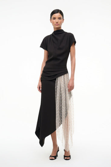 The Effie dress is your ticket to effortless elegance with a touch of shimmer. This showstopper features a gracefully draped high neckline and sweet short sleeves that frame the shoulders just right. The real magic happens at the hip, where gathered metallic tulle creates a dreamy, dimensional silhouette with subtle movement.