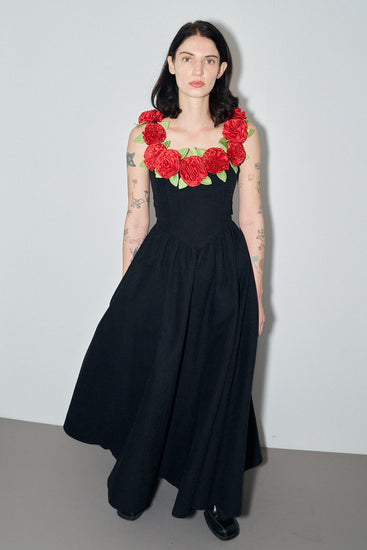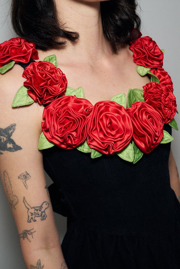 The Fantasia Gown is a delightful blend of elegance and whimsy, featuring hand-crafted satin roses and leaves for a uniquely artistic touch. Made from thick black cotton canvas with a soft cotton-lined bodice, it offers both structure and comfort.