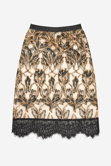 Add a touch of glam with the LATOSHA SKIRT, featuring a gorgeous, continuous gold flower appliqué that catches every eye. The elegant side slit teases a peek of the underskirt—style it your way! Wear it solo for a sleek look or pair it with the underskirt (sold separately) for added flair and volume.