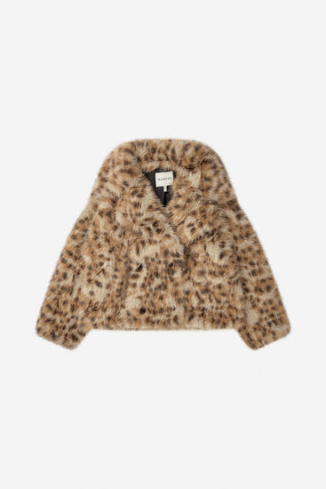 A luxurious short faux fur jacket featuring an all-over leopard print crafted from 100% recycled polyester. Designed with a double-breasted button front, wide collar, and side pockets, this statement coat blends timeless sophistication with playful edge. Perfect for both casual layering and elevated evening looks.