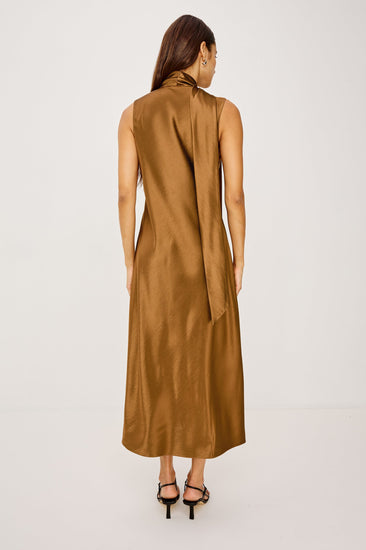 Introducing the Lorenza—a dress that practically glows with sophistication. This midi marvel drapes in sumptuous silky fabric with an irresistible lustrous sheen that catches light beautifully. The flattering V-neckline pairs perfectly with an attached self-tie scarf for instant style versatility, while the bias-cut A-line skirt sweeps gracefully with every step.