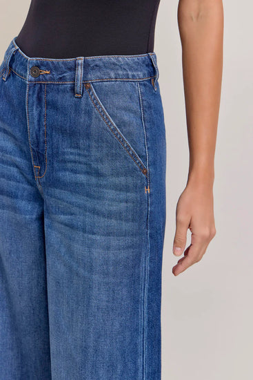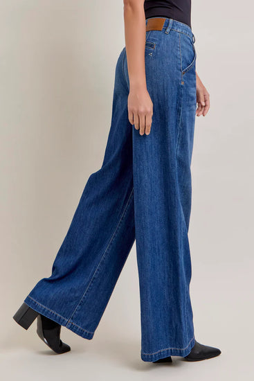 Elevated yet effortless, this wide-leg trouser-style jean presents a minimalist take on denim. In a soft, drapey fabric, it features a high rise and full-length wide leg that floats past the ankle for fluid movement. The dark wash adds polish, while the lightweight construction makes these jeans perfect for transitional dressing.