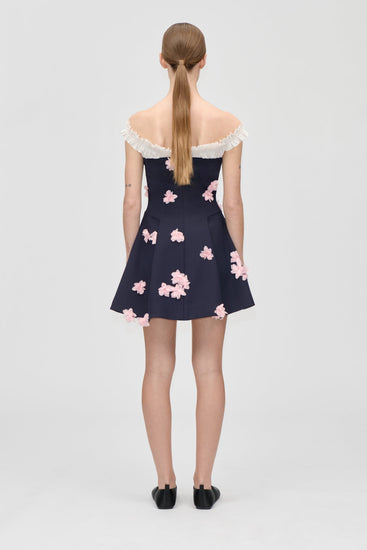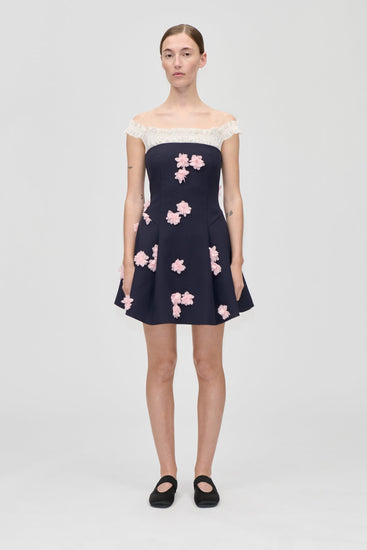 Playful yet refined, this dark navy mini dress from Stine Goya is adorned with soft pink 3D floral appliqués for a touch of sculptural romance. The fitted bodice and flared skirt create a flattering silhouette, balanced by ruffled cream shoulder straps that add contrast and charm.