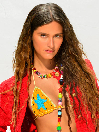 Introducing the Rainbow Town Necklace: a psychedelic statement piece featuring colorful glass charms and a playful array of iconic symbols including a smiley, peace sign, and mushroom. Perfect for adding a pop of personality to any outfit, this necklace is sure to bring a smile to your face (and others)!