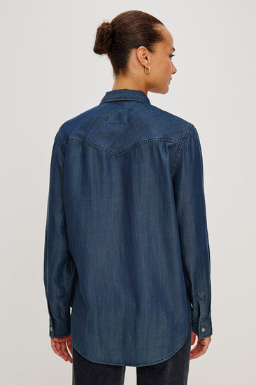 The Remi shirt from Rails is a western-inspired, utility-style essential crafted from soft Tencel denim. Featuring a notched collar, functional pockets, and etched logo faux horn buttons, this trans-seasonal piece balances effortless polish with everyday wearability.