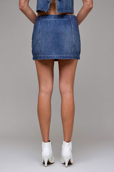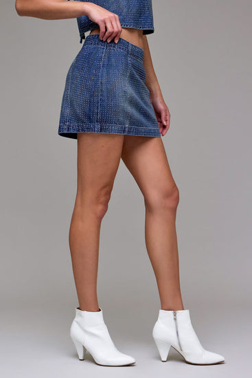 Turn up the texture. This micro-mini skirt from Hidden Jeans features a dark wash denim base with shimmering rhinestone embellishment, designed with a high rise and a crisp silhouette that demands attention. Crafted from 73% cotton / 27% rayon and finished for modern ease.