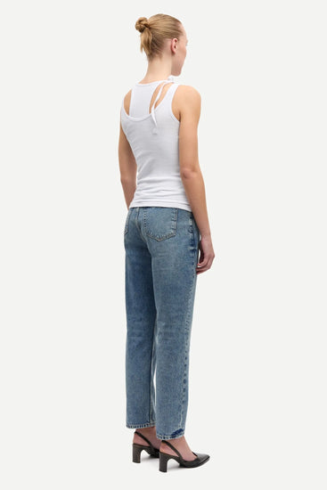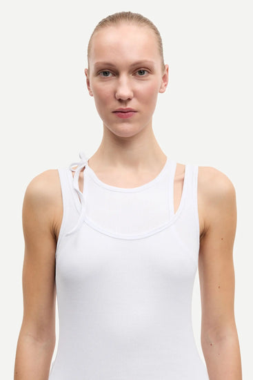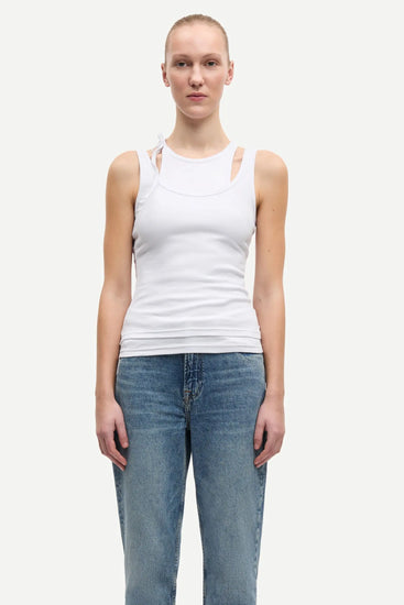 This double-layered tank top offers a sleek, slim fit that hugs your silhouette just right. The playful self-tie detail at the round neckline adds a flirty touch, making it perfect for layering or wearing solo on sunny days. Effortlessly stylish and fun, the Samsoe Samsoe SACLANTON TOP is your new go-to for casual chic.