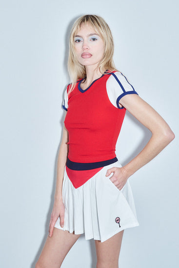 Playful and versatile, this sporty baby tee features a classic color-block design with red as the main body, white sleeves, and navy stripes paired with navy trim. Perfect for casual everyday wear or layering, this fitted tee brings retro athletic vibes to your wardrobe.
